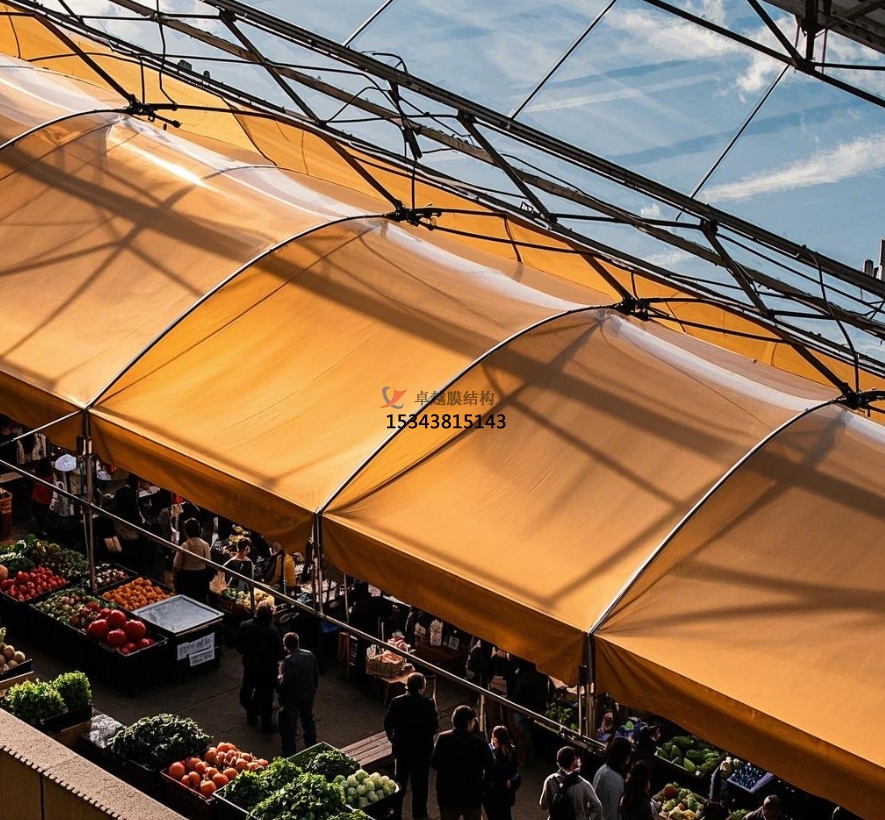 在城市的煙火氣味中,農(nóng)貿(mào)商場(chǎng)是不可或缺的存在,它承載著新鮮食材的匯聚與居民日常生活的快捷。但是,傳統(tǒng)農(nóng)貿(mào)商場(chǎng)頂棚在長(zhǎng)期運(yùn)用中暴露出許多問題,如年久失修易漏雨、空間布局局促、外觀陳腐等。膜結(jié)構(gòu)頂棚的出現(xiàn),宛如一陣清風(fēng),為農(nóng)貿(mào)商場(chǎng)帶來了全新的生機(jī)與革新。