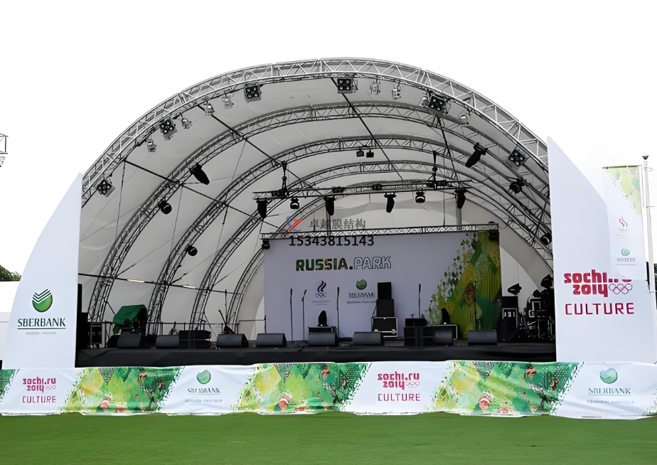 在野外展覽、商業(yè)促銷活動、主題派對等場合,舞臺膜結(jié)構(gòu)也得到了廣泛運(yùn)用。它可以作為扮演舞臺、展現(xiàn)平臺或活動場所的遮陽設(shè)備。例如,在一些汽車品牌的野外展現(xiàn)活動中,膜結(jié)構(gòu)舞臺被規(guī)劃成與汽車品牌形象相符合的造型,既為新車展現(xiàn)供給了一個共同的平臺,又能招引觀眾的注意力,提高品牌宣傳作用。在野外音樂節(jié)、美食節(jié)等活動中,膜結(jié)構(gòu)舞臺為扮演樂隊、扮演團(tuán)隊供給了扮演空間,一起其共同的造型也成為活動現(xiàn)場的一道亮麗風(fēng)景線,增加了活動的招引力和趣味性。