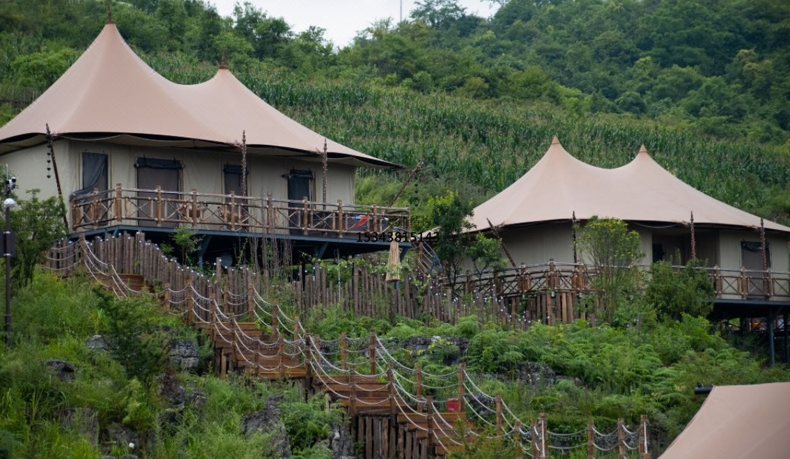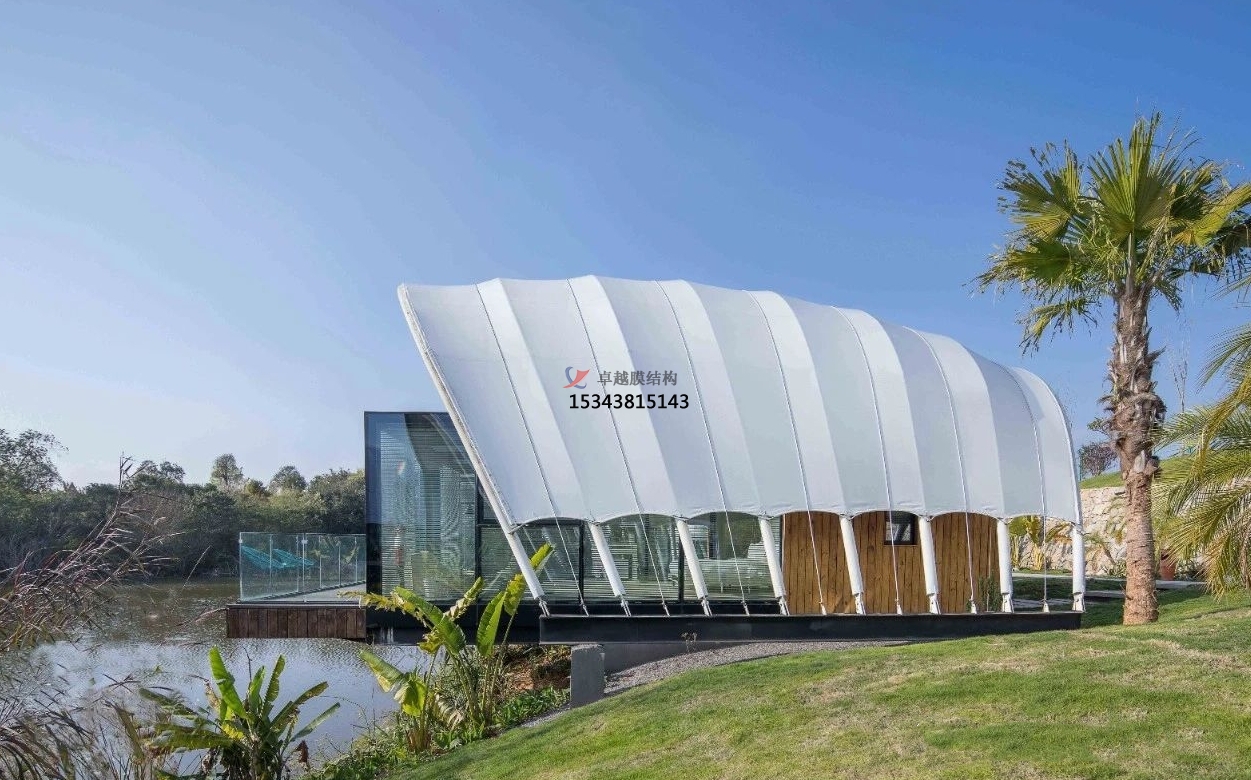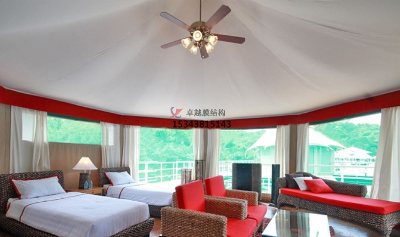 膜結(jié)構(gòu)帳篷酒店膜材是一種無(wú)毒的高分子材料。它具有無(wú)味的特點(diǎn),安裝后沒(méi)有一絲味道。另外,它擁有抗紫外線(xiàn)和反射光線(xiàn)極強(qiáng)的特點(diǎn),而且其抗撕裂的性能強(qiáng),還有B1/M2級(jí)別的阻燃性能,并且使用壽命極強(qiáng),一般壽命都在20年以上。