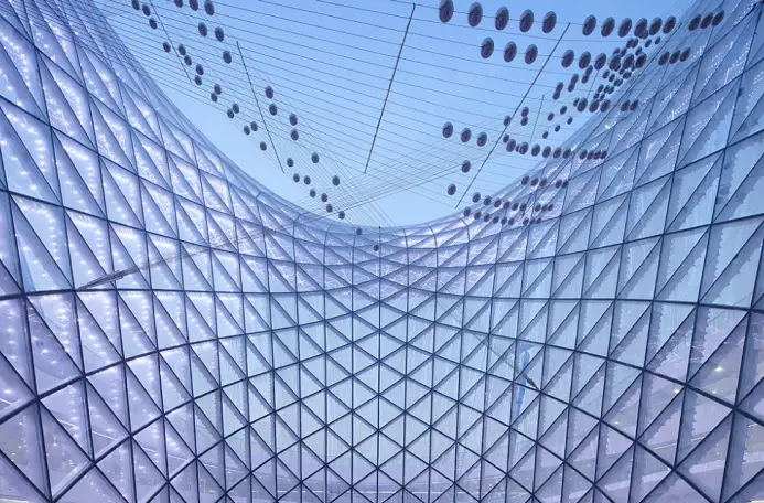 索膜結構建筑應用場景:其應用場景廣泛,可在體育場館、展覽中心、機場航站樓、景觀建筑、商業(yè)建筑等領域內(nèi)使用。在體育場中,館如北京的國家體育場“鳥巢”,其設計靈感源于索膜結構思想,索膜結構可為體育場館提供大跨度無柱空間,滿足觀眾視線和賽事功能需求。在展覽中心能夠提供寬敞明亮的無柱展覽空間,便于展品布置和人流疏散,同時自然采光也能提升展覽效果。在機場航站樓可創(chuàng)造出開闊的候機和交通空間,使旅客能清晰地看到機場的布局和指示標志,膜材的透光性還能讓室內(nèi)空間更加舒適。景觀建筑領域,可在公園、廣場等場所,可設計成各種造型的景觀小品、遮陽設施等,為城市增添特色和藝術氛圍。在商業(yè)建筑中,如商業(yè)街、購物中心的入口、屋頂或中庭等部位,可采用索膜結構來吸引顧客,營造獨特的商業(yè)氛圍。