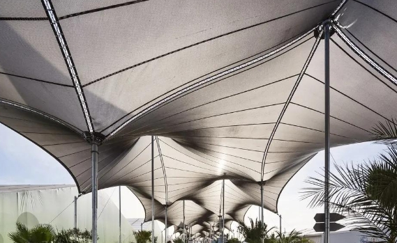 索膜結構建筑的優(yōu)勢特點:其優(yōu)勢特點有大跨度無柱空間、輕質(zhì)節(jié)能、快速施工、藝術表現(xiàn)力、造型自由、節(jié)能環(huán)保、抗風抗震強、透光性好、維護成本低等。大跨度無柱空間表現(xiàn)在其能突破傳統(tǒng)結構限制,覆蓋面積可達數(shù)萬平方米(如青島頤中體育場3萬㎡屋面)。輕質(zhì)節(jié)能表現(xiàn)在其自重僅為傳統(tǒng)建筑的1/30,減少基礎造價;透光膜材降低日間照明能耗。快速施工主要指工廠預制膜片與索構件,現(xiàn)場組裝效率高,工期可比傳統(tǒng)建筑縮短75%。藝術表現(xiàn)力是指曲面造型自由靈動,如大阪世博會盧森堡館以莫比烏斯帶為靈感的膜結構,兼具投影載體功能。造型自由,能根據(jù)設計師的靈感,實現(xiàn)各種曲面、弧形等獨特造型,讓建筑物更具藝術性。節(jié)能環(huán)保,使用材料較少,制造過程能耗低,膜材透光性好,可大幅減少白天人工照明需求。施工快速,材料輕便,通常通過預制組件進行安裝,施工周期短,能節(jié)省人工和時間成本??癸L抗震強,輕質(zhì)和柔性特點使其在面對風力或地震時能分散外力,減少直接沖擊,提升安全性。透光性好,膜材的透光性可為建筑提供所需照度,創(chuàng)造出自然漫射光的室內(nèi)空間視覺環(huán)境,夜晚還可成為光的雕塑。維護成本低,一些膜材如 PTFE 膜材抗老化性能好,壽命長,且膜面光滑,灰塵等不易附著,經(jīng)雨水沖刷可恢復清潔。