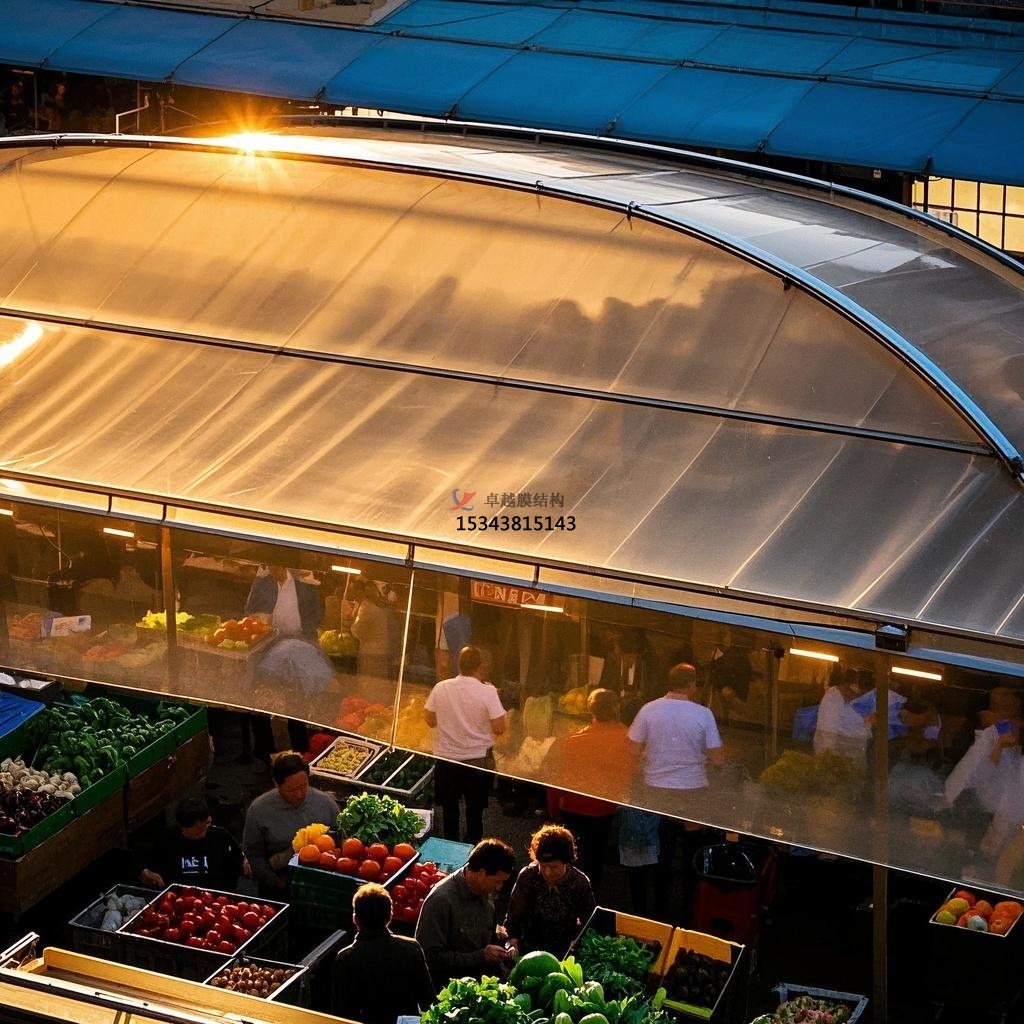 在節(jié)能環(huán)保成為全球共識(shí)的今天,膜結(jié)構(gòu)在農(nóng)貿(mào)市場中的應(yīng)用體現(xiàn)了綠色建筑的理念。如前文所述,膜材的良好透光性減少了白天對(duì)人工照明的需求,降低了能源消耗。同時(shí),膜結(jié)構(gòu)的保溫隔熱性能也有助于調(diào)節(jié)市場內(nèi)部的溫度,減少空調(diào)等設(shè)備的使用頻率,進(jìn)一步節(jié)約了能源。此外,膜材可回收利用,在農(nóng)貿(mào)市場進(jìn)行改造或拆除時(shí),不會(huì)產(chǎn)生大量的建筑垃圾,對(duì)環(huán)境友好。這種節(jié)能環(huán)保的特性,不僅符合現(xiàn)代城市發(fā)展的要求,也為市民提供了一個(gè)更加綠色、健康的購物環(huán)境。?