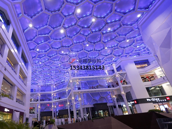 ETFE膜廠家更后通過氣枕制作過程包括膜片疊合及定位焊接、邊帶定位焊接、氣枕周邊焊接等工序。在氣枕周邊裝上夾具,將其固定在檢查專用的鋼架上。連接臨時充氣管,想氣枕內(nèi)部充入空氣,使其內(nèi)壓達(dá)到或超過實際工作壓力,并保持壓力一定時間。檢查氣枕的各焊縫的焊接強度及密封情況,并檢查氣枕的矢高是否符合設(shè)計要求。