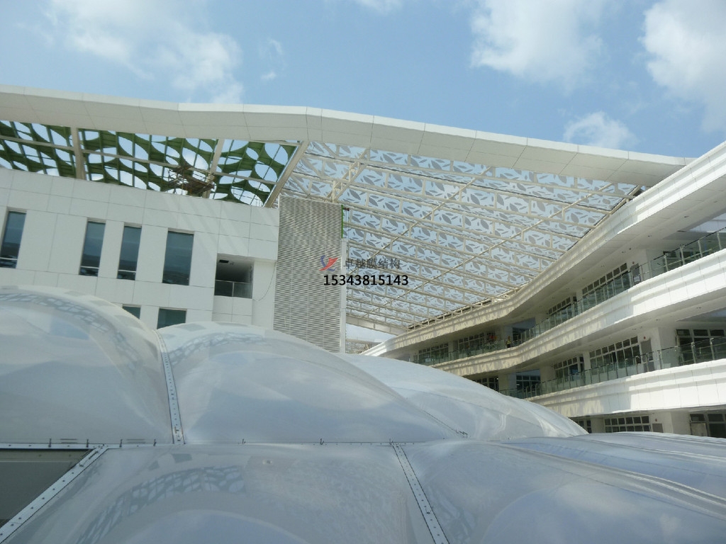 ETFE膜結(jié)構(gòu)透光性怎么樣?ETFE膜材自身由于直接熱塑成形,厚度很薄,原本就具有很高的透光率。通過對膜材表面鍍銀色圓點(diǎn)可以調(diào)節(jié)膜材的透光率,從而滿足室內(nèi)不同的采光需求。