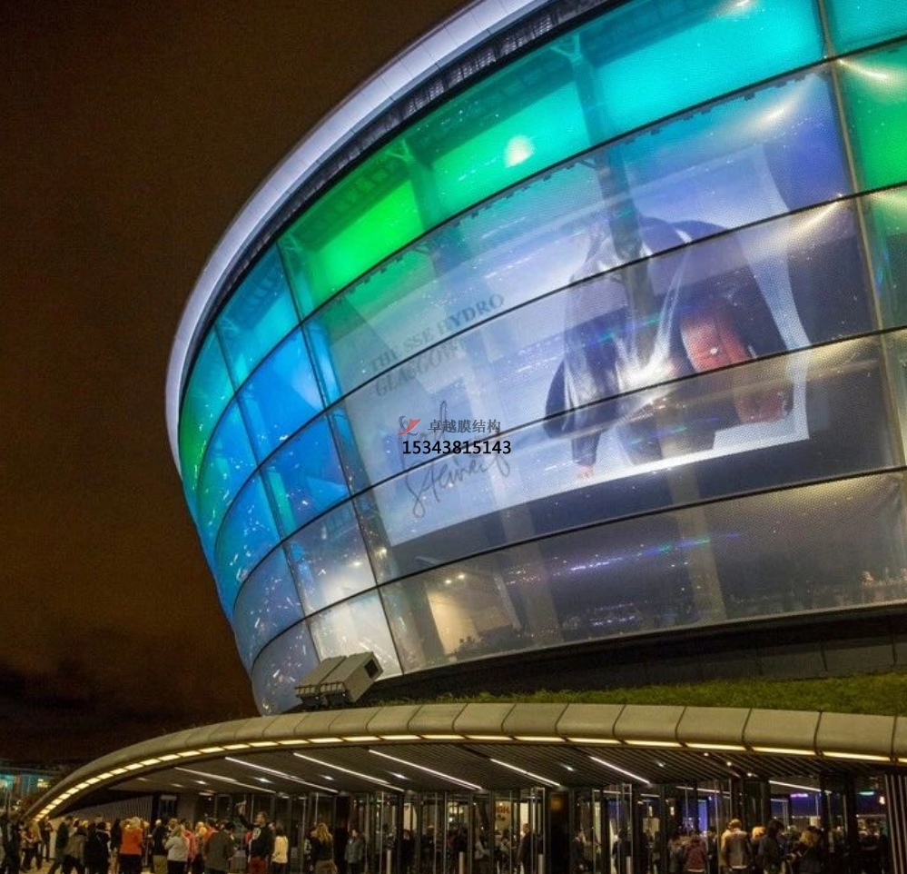 ETFF膜可以帶有印花圖案,印花圖案可有多種形式,在滿足視覺(jué)效果和遮陽(yáng)要求的同時(shí),還可保持幕墻的透明性,我們目前還可以做成鑲嵌式圖案(可更換),用于品牌及廣告展示。