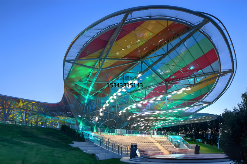 同時(shí),ETFE膜結(jié)構(gòu)的延展性大于400%,確保膜結(jié)構(gòu)可以經(jīng)過張拉力形成各種三維空間曲面造型。