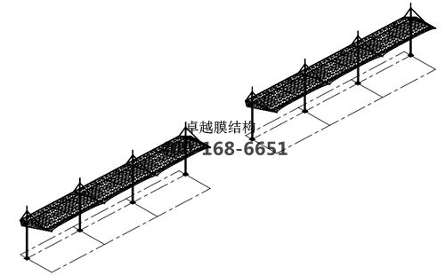 膜材采用白色高端國產星益達高自潔環(huán)保建筑膜材,鋼結構采用更好的標準Q235B鋼材,表面采用酚醛底漆處理,面漆采用白色鋼結構專用快干磁漆。
