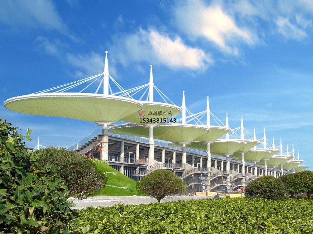 張拉膜景觀廣泛適用于任何大小規(guī)模的空間。張拉式膜結構、以膜材、鋼索及支柱構成,利用鋼索與支柱在膜材中導入張力以達安定的形式。除了可實踐具有創(chuàng)意、創(chuàng)新且美觀的造型外也是更能展現(xiàn)膜結構精神的構造形式。近年來,大型跨距空間也多采用以鋼索與壓縮材料構成鋼索網來支撐上部膜材的形式。張拉膜景觀施工精度要求高,結構性能強,且具豐富的表現(xiàn)力。大型張拉膜景觀球場都是和膜結構看臺一樣采用剛性骨架結構,所以必須保證鋼結構的鏈接到位牢固,做好防腐蝕處理這樣才能使得工程質量到位。節(jié)點,膜材與結構的節(jié)點,地基節(jié)點,膜材拼接的節(jié)點和結構鏈接的節(jié)點,這些節(jié)點是形成膜結構的關鍵,膜材的節(jié)點關系到膜結構的穩(wěn)定,這些節(jié)點是膜材受拉力的地方,膜結構靠的就是這樣的拉力形成內應力來維持膜結構的形狀。節(jié)點要充分保證其牢固和可活動性。膜結構工程在日常生活中多數(shù)是像張拉膜景觀、膜結構景觀建筑、膜結構休息亭等著樣的小型建筑體系,其施工速度快難度低,所以質量很好把關。