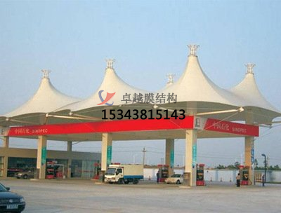 該加油站采用了先進的張拉技術,通過鋼索和支撐桿將膜結構固定在地上,形成了寬敞明亮的加油空間。整個加油站的膜結構采用了高強度聚酯纖維材料,具有高透明度、抗紫外線、防水、防火等特點,保證了加油體驗的安全性和舒適性。