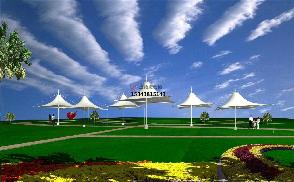 5、每年雨季和冬季來臨前,應(yīng)對(duì)園林景觀膜結(jié)構(gòu)的膜面進(jìn)行檢查和清理,保持膜面排水系統(tǒng)暢通;在積雪量較大的地區(qū),應(yīng)采取必要的融雪和排雪應(yīng)急措施。由于膜材料在荷載作用下的變形,在膜表面坡度較小的地方可能會(huì)出現(xiàn)積水。對(duì)張拉膜結(jié)構(gòu)進(jìn)行監(jiān)測(cè),避免暴雨、大雪、融雪后積水。