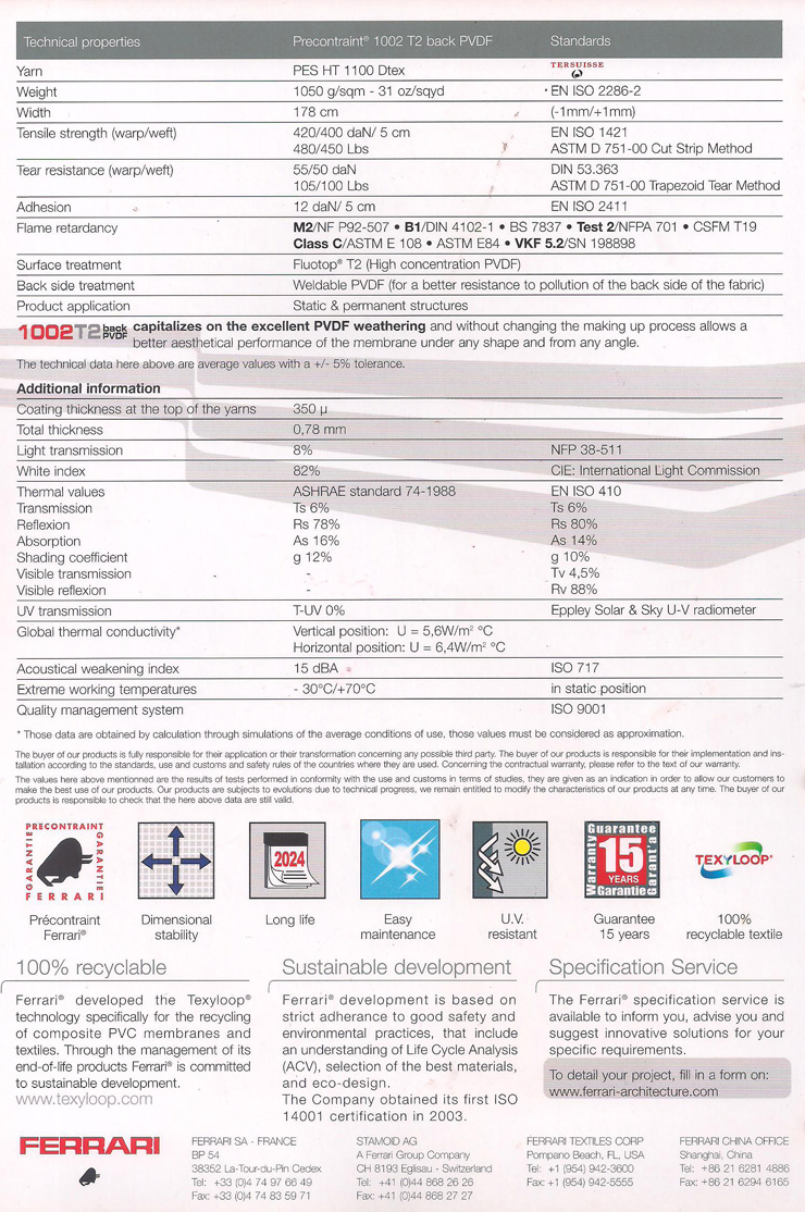 法拉利膜材十多年來,法拉利(PVDF)表面處理的復合膜材被應用在全世界重要的織物建筑工程中。現(xiàn)在,第代膜材再次確認了這一出眾材料性能的更新發(fā)展。法拉利研發(fā)了第代材料正是為了滿足建筑師和業(yè)主在新世紀之初對于織物建筑提出的要求。這一 全新的膜材得益于更新的科研技術,即將PVDF和硬化介體完美地結合。這種特殊的結合明顯地提高了材料的機械強度、使用壽命,并能長期保持織物建筑的原始 美觀。第代膜材在積累了10多年的經驗的基礎上,可以提供專業(yè)保證。法拉利現(xiàn)在能夠根據要求和每個項目的具體情況,提供12年質量保證 (PRECONTRAINT702除外)。