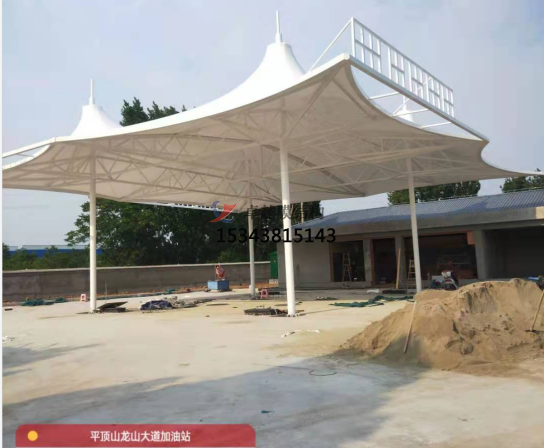 該項目位于平頂山汝州市龍山大道,由中石油直營,采用骨架式弧形軟邊張拉膜,設計壽命15年,膜材采用PVDF5000N 建筑膜材,完工時間2021年6月10日