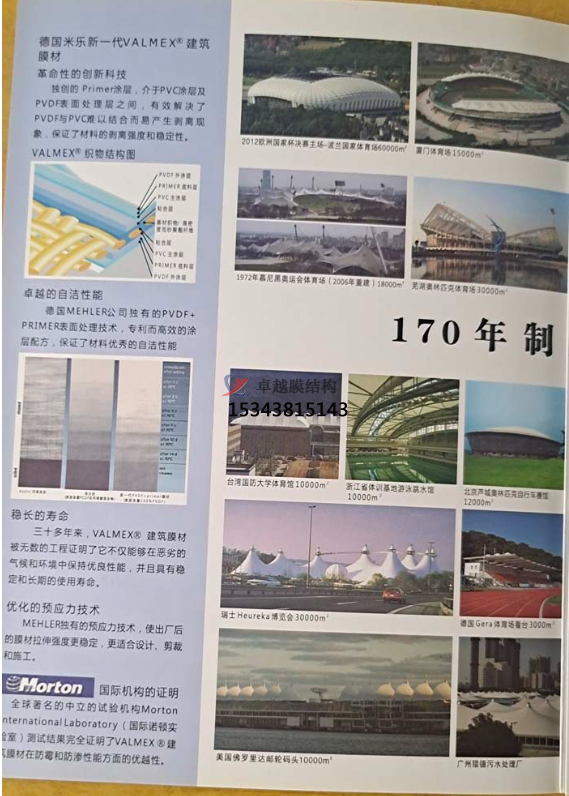 德國MEHLERHAKU米樂公司擁有165年(1837年一2003年)的制造業(yè)經(jīng)驗。通過1S09001質(zhì)量體系認證,所有產(chǎn)品均經(jīng)過嚴格的DIN德國工業(yè)標(biāo)準,以及各個國家的膜材工業(yè)標(biāo)準。2002年,德國米樂公司獲聘為中華人民共和國建設(shè)部《索膜建筑結(jié)構(gòu)制品》行業(yè)標(biāo)準編制委員成員。德國米樂的產(chǎn)品系列涵蓋環(huán)保等各種PVC膜材領(lǐng)域,包括:建筑工程、輕型結(jié)構(gòu)、廣告、遮陽、汽艇、軍用、裝飾、水利環(huán)保,等等。