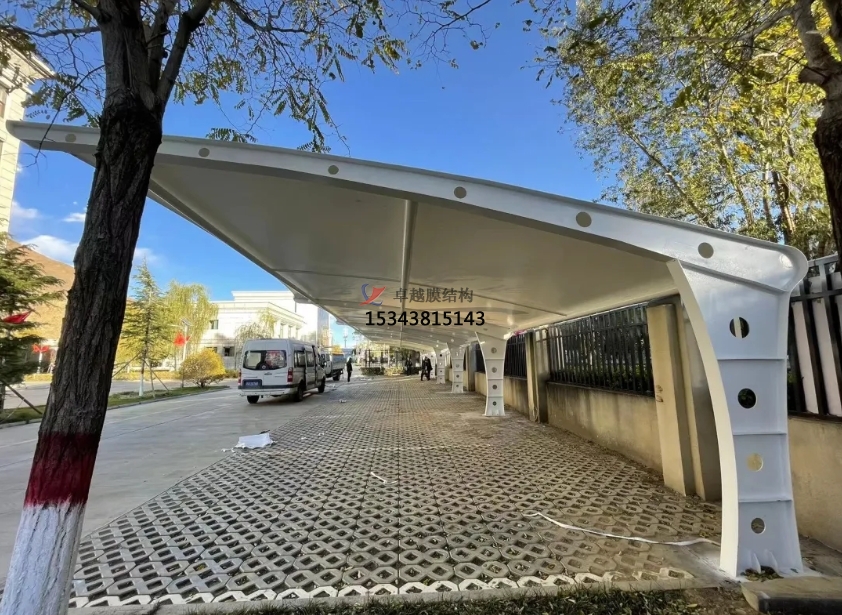 七、在膜結構充電樁工程現(xiàn)場,膜材應安放在搭設的輔助架子上,在室外堆放時應采取保護措施。安裝前應在主體結構上架設臨時的網(wǎng)格拉索,以支承展開的膜材。