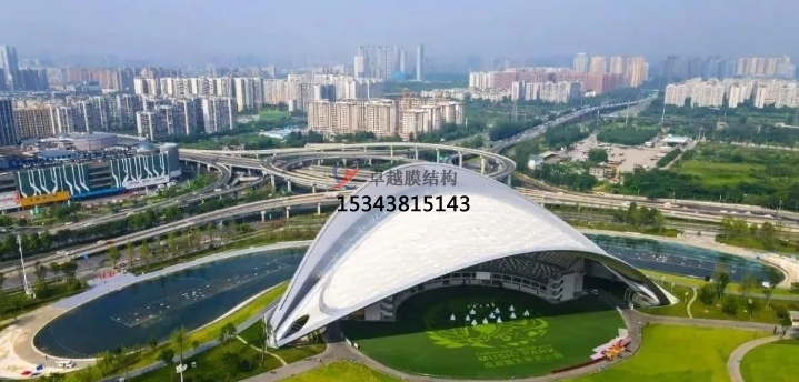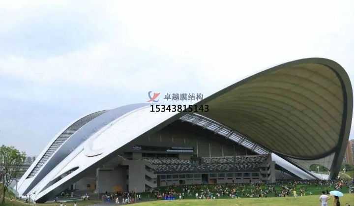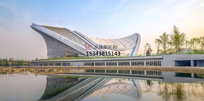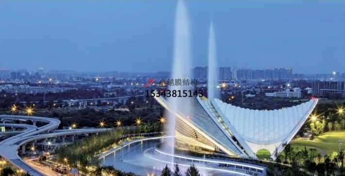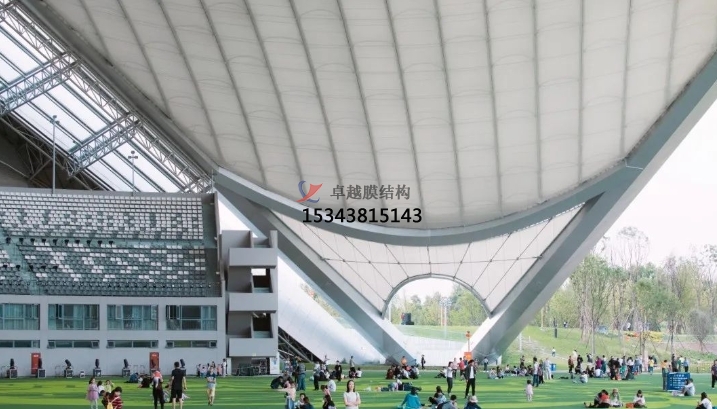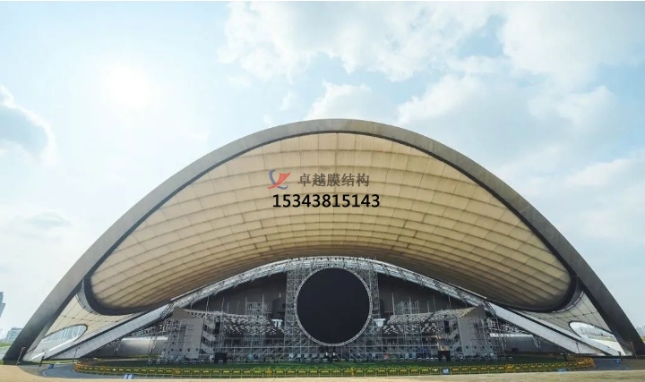獨立罩棚屋面采用“索網+膜結構”,自重輕,大幅減輕了主拱的荷載負擔。膜結構分內外兩層,起遮蔽作用的外層為PVDF膜,內膜為網格膜材。值得一提的是,內膜形成超過5000平方米的沉浸式可投影穹頂天幕,國內較為罕見,成為此演出地的亮點。