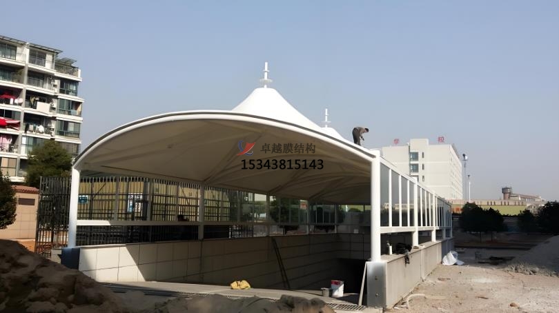 膜結(jié)構(gòu)出入口是一種以高強(qiáng)度膜材料與支撐結(jié)構(gòu)(鋼索、鋼架等)結(jié)合的建筑形式,具有輕盈、美觀、耐用等特點(diǎn),廣泛應(yīng)用于各種場所的建筑形式,主要用于提供遮陽、遮雨的功能,同時具有較高的觀賞性和藝術(shù)感。