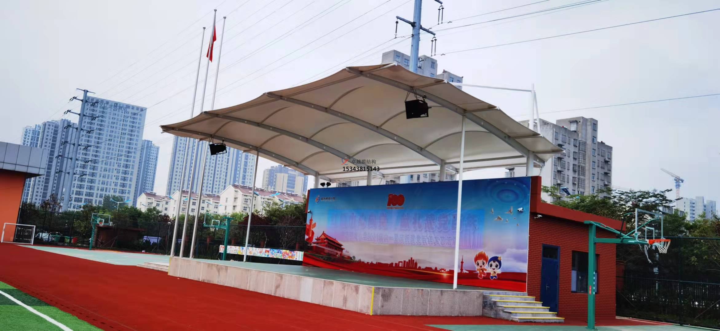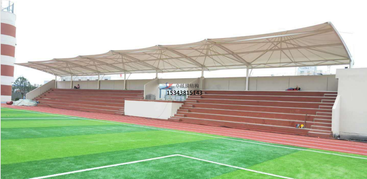 膜結(jié)構(gòu)看臺在體育設(shè)施上主要應(yīng)用在學(xué)校操場運(yùn)動看臺或主席臺屋頂,另外大型體育場館看臺膜結(jié)構(gòu)屋頂也屢見不鮮。看臺造型般由貝殼形峰膜及部張拉膜組成,形式新穎活潑。膜結(jié)構(gòu)看臺將鋼架、索、膜巧妙結(jié)合,通過薄膜、膜邊索、脊索、谷索、拉索、拉桿及定的格構(gòu)梁來穩(wěn)定。膜頂平滑過渡,結(jié)構(gòu)美觀、輕巧、整體造型相互輝映,別具格。