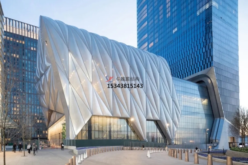 The Shed藝術(shù)中心樓高37米,有一個(gè)可伸縮的建筑表皮,伸縮式外殼由暴露的鋼斜架構(gòu)成,并包裹在半透明墊層中。其墊層由耐用輕質(zhì)且隔熱性能極佳的四氟乙烯(ETFE)聚合物構(gòu)成。