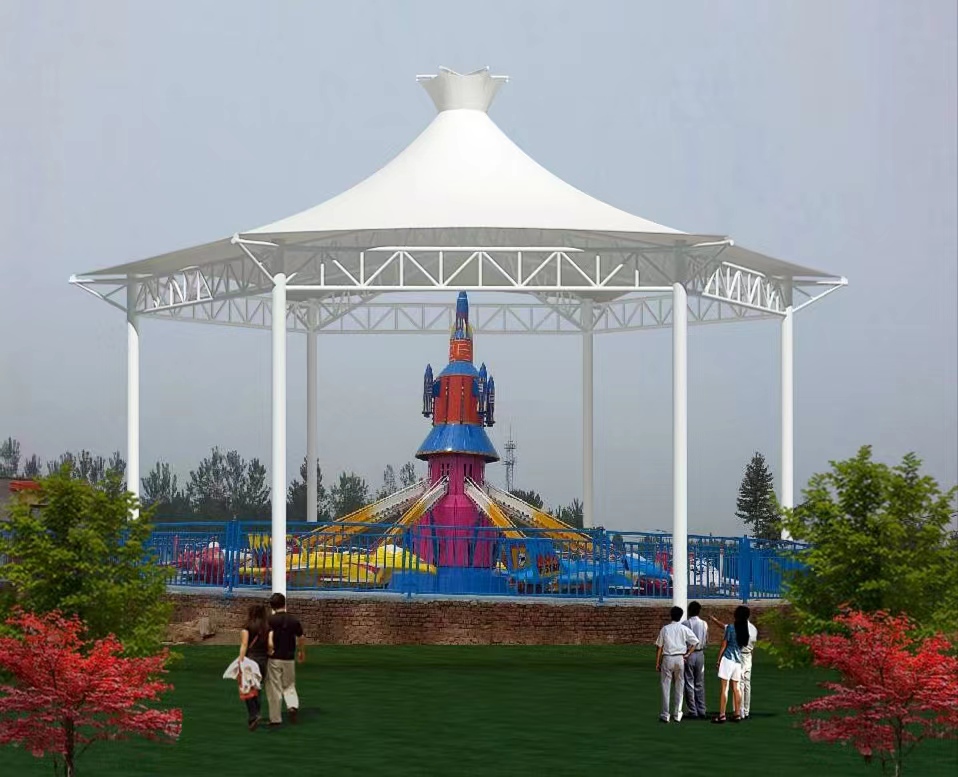面積和形狀:根據(jù)游樂場的規(guī)模和功能需求確定遮陽棚的大小和形狀。遮陽棚可以是簡單的單層結(jié)構(gòu),也可以是多層或多個連接的結(jié)構(gòu),以覆蓋更大的區(qū)域。