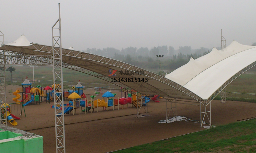 景觀效果:游樂(lè)場(chǎng)的張拉膜遮陽(yáng)作為一種建筑形式,也需要考慮其景觀效果,與游樂(lè)場(chǎng)的環(huán)境相協(xié)調(diào),營(yíng)造出一個(gè)美觀、舒適的活動(dòng)環(huán)境。因此,在選擇膜材料和設(shè)計(jì)時(shí),需要考慮其景觀效果。