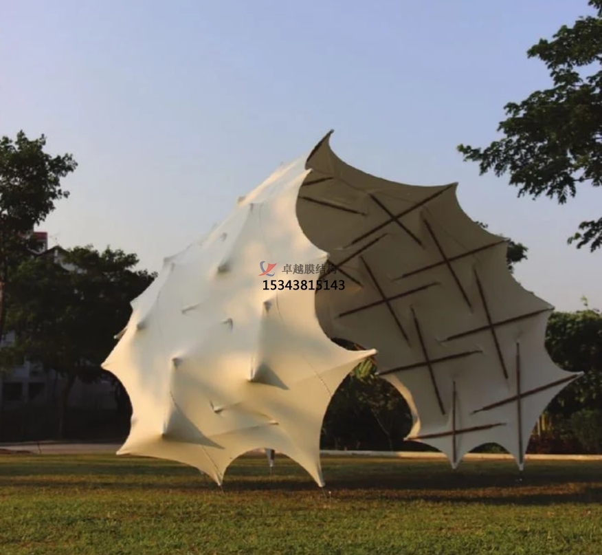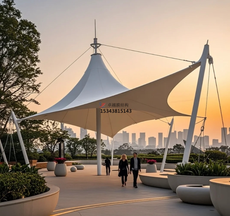 輕質(zhì)高強,穩(wěn)固耐用:景觀膜結(jié)構(gòu)采用的高強度薄膜材料,重量僅約為傳統(tǒng)建筑結(jié)構(gòu)材料的十分之一,極大地減輕了自身重量。但 “輕量級” 的它卻有著超乎想象的強大實力,拉伸強度極高,在面對風荷載與雪荷載時,能憑借出色的韌性與剛性,展現(xiàn)卓越的穩(wěn)定性。在強風天氣中,膜結(jié)構(gòu)可通過自身的柔性變形來緩沖風力,避免因剛性抵抗而導致結(jié)構(gòu)損壞;面對積雪,其合理的造型與支撐設(shè)計能使積雪均勻分布或自然滑落,防止因積雪過重造成坍塌,為景觀設(shè)施提供可靠的安全保障。
