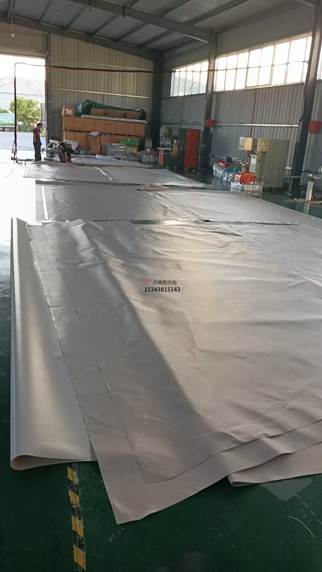 通常,膜面的加工制作包含以下工序:(1)準備工作, 包括技術(shù)準備、場地及設(shè)備準備、膜材料進場檢測等;(2)放樣、排版與下料;(3)熱合試驗;(4)熱合加工;(5)邊角處理;(6)清洗、包裝。