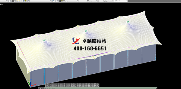 膜結構設計應考慮恒荷載、活荷載、風荷載、雪荷載、預張力、氣壓力、溫度和支座不均勻沉降等作用。荷載標準值應按現(xiàn)行更好的標準《建筑結構荷載規(guī)范》GB50009的規(guī)定采用,膜面的活荷載標準值取0.3kN/㎡。