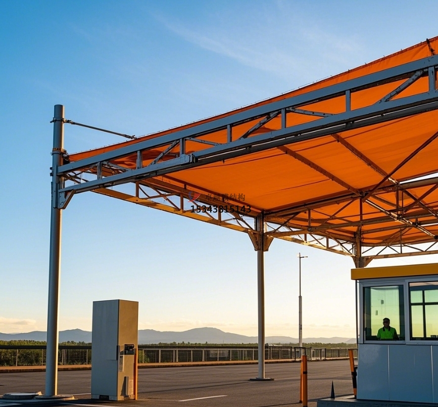 支撐構(gòu)件:常見的支撐體系為鋼結(jié)構(gòu),如 Q235、Q345 等鋼材。鋼柱、鋼梁組成結(jié)構(gòu),為膜材供給安定支撐。部分大型或造型雜亂的收費站還會選用鋼索輔助支撐,使用鋼索的張拉作用,增強膜結(jié)構(gòu)全體穩(wěn)定性,一起可塑造出更共同的造型 。