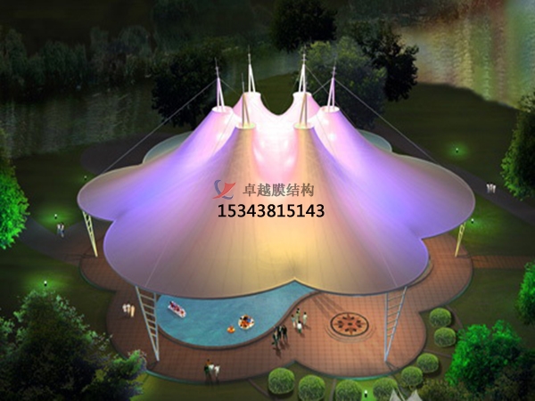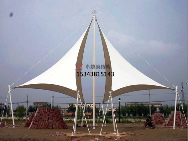 一個城市的中心區(qū)反映一個城市的地理風(fēng)貌和民族風(fēng)情,同時,也是一個城市文化發(fā)展程度的標(biāo)志。而景觀設(shè)計要求其具有廣泛的可讀性、雅俗共賞,既有超凡脫俗的藝術(shù)價值,又能使大眾喜聞樂見與大眾息息相通。膜結(jié)構(gòu)以其輕盈飄逸的造型、柔美并帶有力量的曲線和大跨度和大空間的鮮明個性和標(biāo)識性,應(yīng)用于城市小品設(shè)計中。