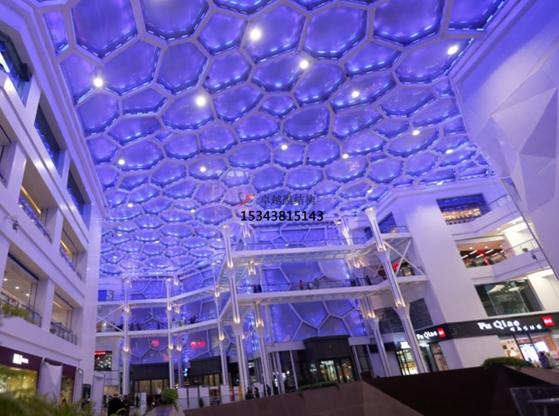 簡介:大家如果去大型的商場可能會注意到,其廊道或者大廳頂部都是采用了半透明或者透明的建筑材料,這種設(shè)計(jì)不僅滿足了商場對于自然采光的要求,使得整個商場看上去更加的敞亮,而且在白天還能大大的節(jié)省照明設(shè)施的運(yùn)行時間,降低了能耗,以前在膜結(jié)構(gòu)沒有大規(guī)模應(yīng)用的時候,實(shí)現(xiàn)這種效果,都是采用了陽光板或者鋼化玻璃等材料,這些材料都有明顯的缺點(diǎn),比如說陽光板受陽光直射的作用老化速度會大大加快,鋼化玻璃自重較重對于支承結(jié)構(gòu)要求高,而且安全性是個難點(diǎn),但是膜結(jié)構(gòu)的出現(xiàn)解決了傳統(tǒng)材料的種種弊端,PTFE及ETFE膜材不僅可以實(shí)現(xiàn)透光性,而且自重輕,安全性更高,特別是ETFE其高自潔、高透光特性已經(jīng)成為了大型商業(yè)街區(qū)穹頂天幕的首選。