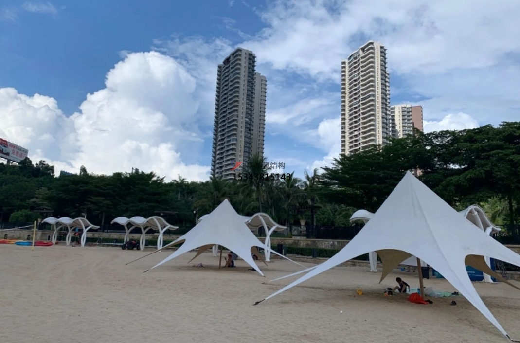 景觀棚膜結(jié)構(gòu)最大的特點(diǎn)之一就是其幾乎不受限制的造型能力。設(shè)計(jì)師可以根據(jù)不同的場(chǎng)地需求、文化背景以及功能要求,創(chuàng)造出如貝殼般優(yōu)雅的曲線、如帆船般靈動(dòng)的輪廓、如花朵般綻放的形態(tài)等等。這種獨(dú)特的造型不僅能夠成為視覺(jué)上的焦點(diǎn),提升整個(gè)區(qū)域的景觀品質(zhì),還能很好地與周?chē)淖匀画h(huán)境或建筑風(fēng)格相融合,形成和諧統(tǒng)一的整體畫(huà)面。