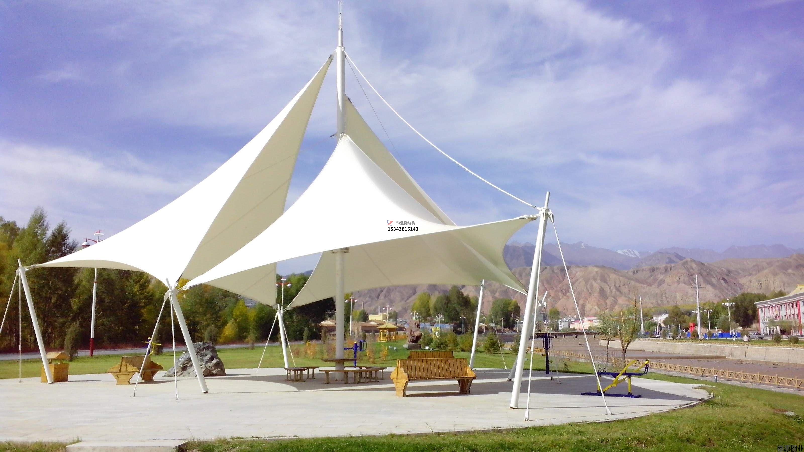 景觀膜結構遮陽棚現(xiàn)場安裝施工順序為先鋼構件后張拉膜。