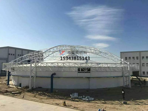 阜陽卓越膜結構工程公司是集污水池加蓋反吊膜加蓋工程設計施工、結構設計、靜動力計算分析、整體結構安裝以及使用維護于一體的綜合性工程公司。污水池反吊膜結構中的高強度柔韌薄膜稱膜材,它是一種耐腐蝕、耐高溫、耐久用、高強度的樹脂類涂層織物,由多種復合PVC樹脂涂層刀刮成型,具有質地柔韌、厚度小、重量輕、透光性好的特點。對自然光吸收和透射能力、阻燃,具有良好的耐久、防火、氣密等特性;表面經過特氟龍?zhí)幚砘蚨趸伩估匣幚恚哂休^高的自清潔性能。下面就大家介紹一下我公司在阜陽地區(qū)完成的部分污水池膜結構封閉項目。