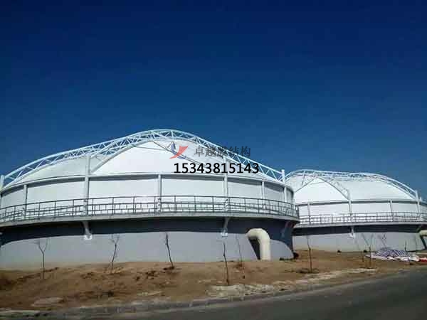 2、我公司利用膜結(jié)構(gòu)的輕巧,別致的造型建造各種半封閉,全封閉的不行空間;污水池反吊膜結(jié)構(gòu)中的高強(qiáng)度柔韌薄膜稱膜材,它是一種耐腐蝕、耐高溫、耐久用、高強(qiáng)度的樹脂類涂層織物,由多種復(fù)合PVC樹脂涂層刀刮成型,具有質(zhì)地柔韌、厚度小、重量輕、透光性好的特點(diǎn)。對(duì)自然光吸收和透射能力、阻燃,具有良好的耐久、防火、氣密等特性;表面經(jīng)過特氟龍?zhí)幚砘蚨趸伩估匣幚?,具有較高的自清潔性能。下面就大家介紹一下我公司在泰安市地區(qū)完成的部分污水池膜結(jié)構(gòu)封閉項(xiàng)目。