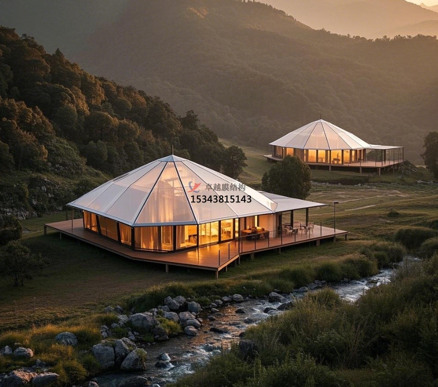 帳篷酒店膜結(jié)構(gòu)以其豐富多變的造型脫穎而出。設(shè)計靈感常來源于自然界,如白蟻巢穴、蜂巢、螢火蟲和蝸牛等生物形態(tài)。建筑師通過巧妙構(gòu)思,將這些元素融入設(shè)計,打造出方形帳篷、螺旋帳篷等獨特空間結(jié)構(gòu)。帳篷的輕盈、通透特質(zhì),與周圍自然環(huán)境完美呼應,形成一道獨特風景線。像可見澤棲帳篷酒店,其客房 “水映螢火” 采用玻璃箱外蓋膜結(jié)構(gòu),既保證貼水居住的舒適感,又解決遮陽難題;“螺中洞天” 客房則運用雙層膜與保溫棉結(jié)構(gòu),滿足螺旋造型需求的同時,提升內(nèi)部舒適度,從不同角度展現(xiàn)出膜結(jié)構(gòu)在美學設(shè)計上的無限可能。