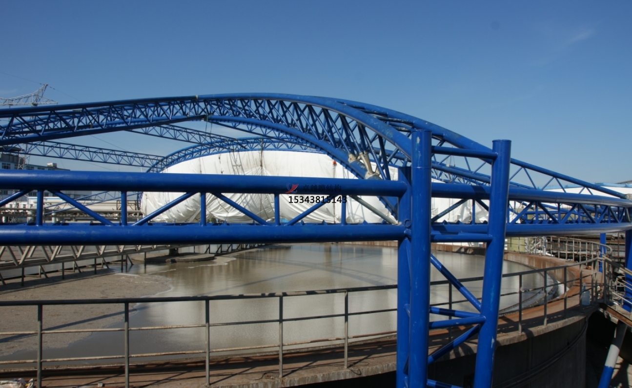 隨著工業(yè)技術(shù)的不斷成熟,污水池加蓋一般采用反吊膜結(jié)構(gòu)形式,對(duì)污水池內(nèi)廢氣進(jìn)行處理。這種結(jié)構(gòu)采用膜材反吊的原理,將鋼結(jié)構(gòu)至于膜材外層,這樣,就有效的避免了池內(nèi)廢氣對(duì)鋼結(jié)構(gòu)的腐蝕,延長(zhǎng)了鋼結(jié)構(gòu)的使用壽命,提高了反吊膜結(jié)構(gòu)的廢氣除臭率。