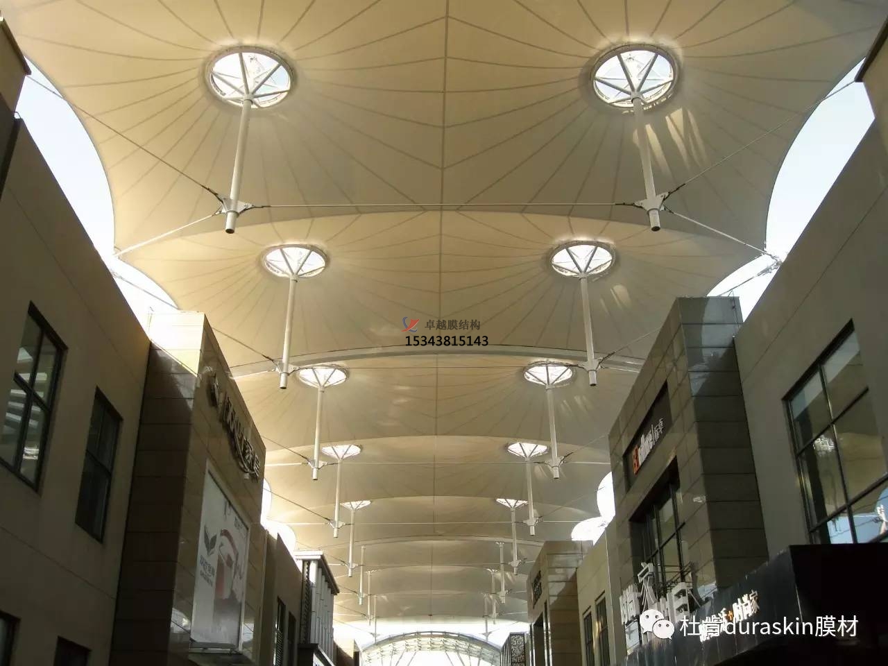 建筑入口使城市公共空間與建筑空間相鄰的界面,成為城市空間的組成部分。它是人們視覺最先接觸的部分,因此,除了功能以外,還應有很強的標識性,并能體現(xiàn)建筑的個性,是建筑環(huán)境和城市景觀的重要組成部分。由于膜結構自然的曲線美是其他結構類型無法比擬的,故成為近來建筑入口及屋頂經(jīng)常采用的形式。