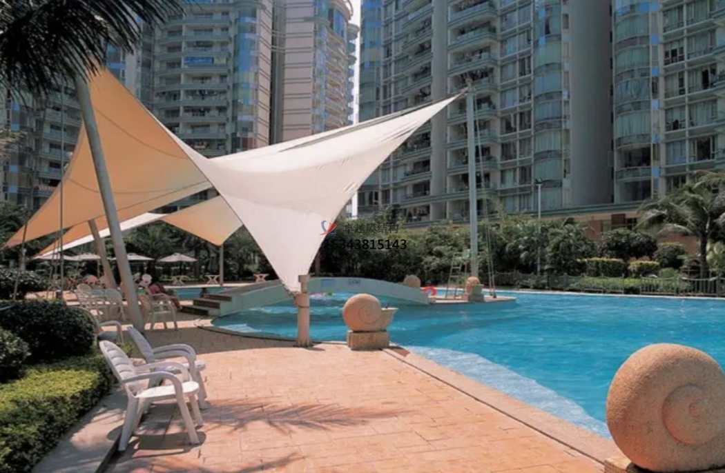 膜結(jié)構(gòu)遮陽棚所采用的膜材料,具有自重輕、透光性好、隔熱性能強(qiáng)、耐腐蝕、防水、耐菌、耐高溫、抗紫外線、老化慢等優(yōu)點(diǎn)。這種材料不僅能夠提供有效的遮陽效果,還能有效隔絕紫外線,保護(hù)游泳者的皮膚。同時,膜材料具有良好的自潔能力,不易沾染灰塵,依靠雨水沖洗就能保持潔凈,大大降低了后期維護(hù)成本。