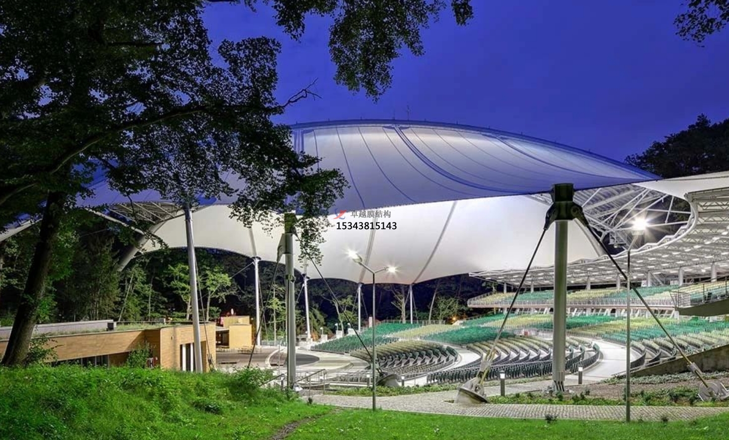 舞臺(tái)膜結(jié)構(gòu)遮陽(yáng)棚的膜材料具有一定的透光性,可以根據(jù)演出需要調(diào)節(jié)光線的明暗和色彩。在白天,自然光透過(guò)膜材料灑落在舞臺(tái)上,為演出增添了一份自然和溫馨;在夜晚,舞臺(tái)燈光與膜材料的透光性相結(jié)合,可以營(yíng)造出夢(mèng)幻般的舞臺(tái)效果。