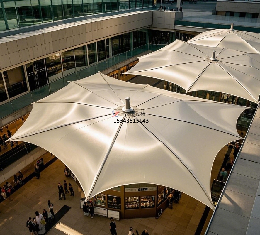 露天步行商業(yè)街的公共座椅旁,膜結(jié)構(gòu)遮陽(yáng)傘是常見(jiàn)的配置。它與傳統(tǒng)可移動(dòng)遮陽(yáng)傘不同,采用先預(yù)埋基礎(chǔ),再搭建鋼構(gòu),最后張拉膜材的方式固定。其造型豐富多樣,顏色可根據(jù)整體環(huán)境定制,不僅具備出色的抗紫外線、抗老化性能,使用壽命長(zhǎng),而且自潔性好,為商業(yè)街增添了一抹亮麗色彩,成為實(shí)用與美觀兼具的景觀設(shè)施。
