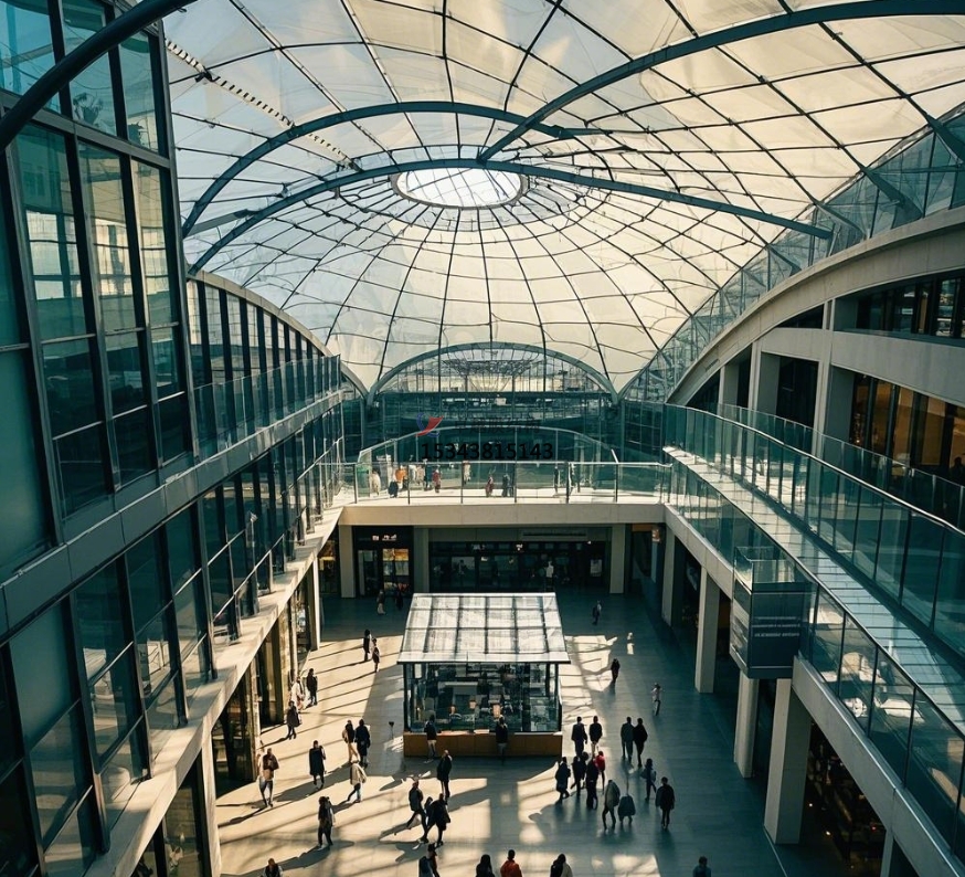 在大型商業(yè)廣場(chǎng)的廊道或大廳頂部,常能見(jiàn)到膜結(jié)構(gòu)穹頂與天幕的身影。以往,實(shí)現(xiàn)自然采光多依賴陽(yáng)光板或鋼化玻璃,然而陽(yáng)光板易老化,鋼化玻璃自重過(guò)大且存在安全隱患。膜結(jié)構(gòu)的出現(xiàn)改變了這一局面,PTFE 及 ETFE 膜材透光性佳、自重輕、安全性高,尤其是 ETFE,其高自潔、高透光特性,讓穹頂天幕在白天引入充足自然光線,節(jié)省照明能耗,夜晚在燈光映照下,又營(yíng)造出如夢(mèng)如幻的氛圍,為顧客帶來(lái)獨(dú)特的購(gòu)物體驗(yàn)。