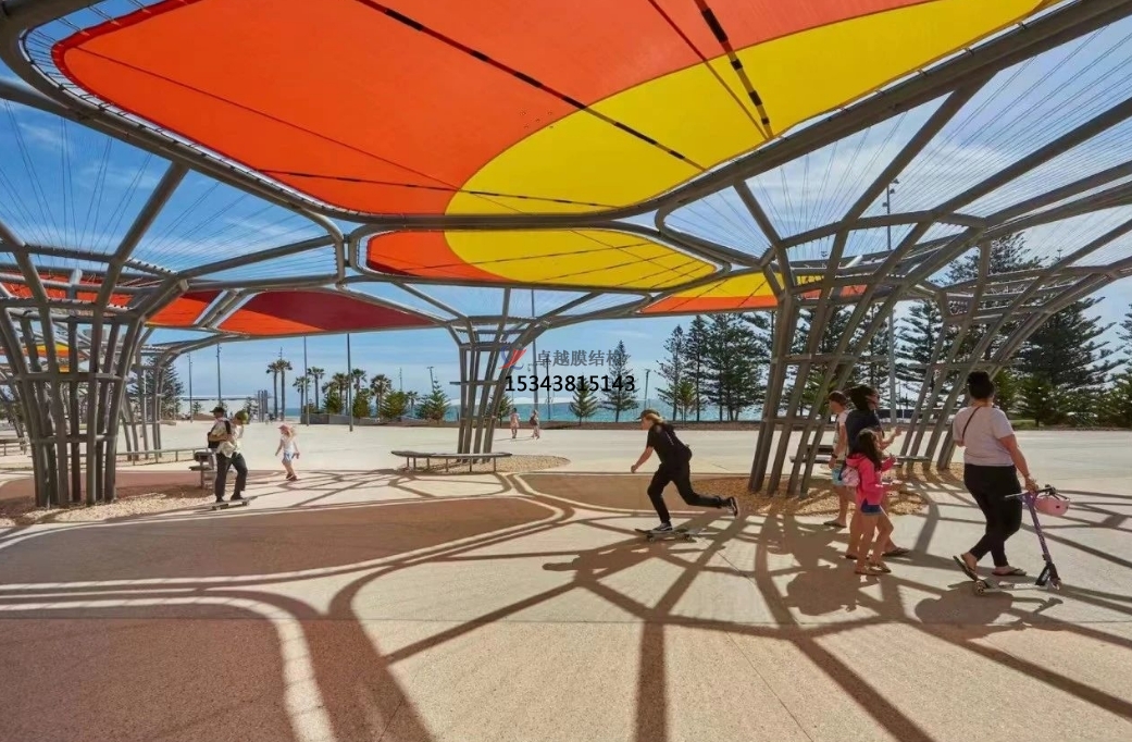 未來的景觀棚膜結(jié)構(gòu)將不再僅僅局限于單一的遮陽避雨功能,而是會朝著多功能融合的方向發(fā)展。比如,在景觀棚內(nèi)集成光伏發(fā)電系統(tǒng),將太陽能轉(zhuǎn)化為電能,實現(xiàn)能源的自給自足;或者結(jié)合聲學(xué)設(shè)計,使其具備良好的隔音效果,可用于舉辦小型音樂會、演講等活動;還可以與水幕景觀、噴泉等水景元素相結(jié)合,打造出更加豐富多彩的戶外體驗空間。