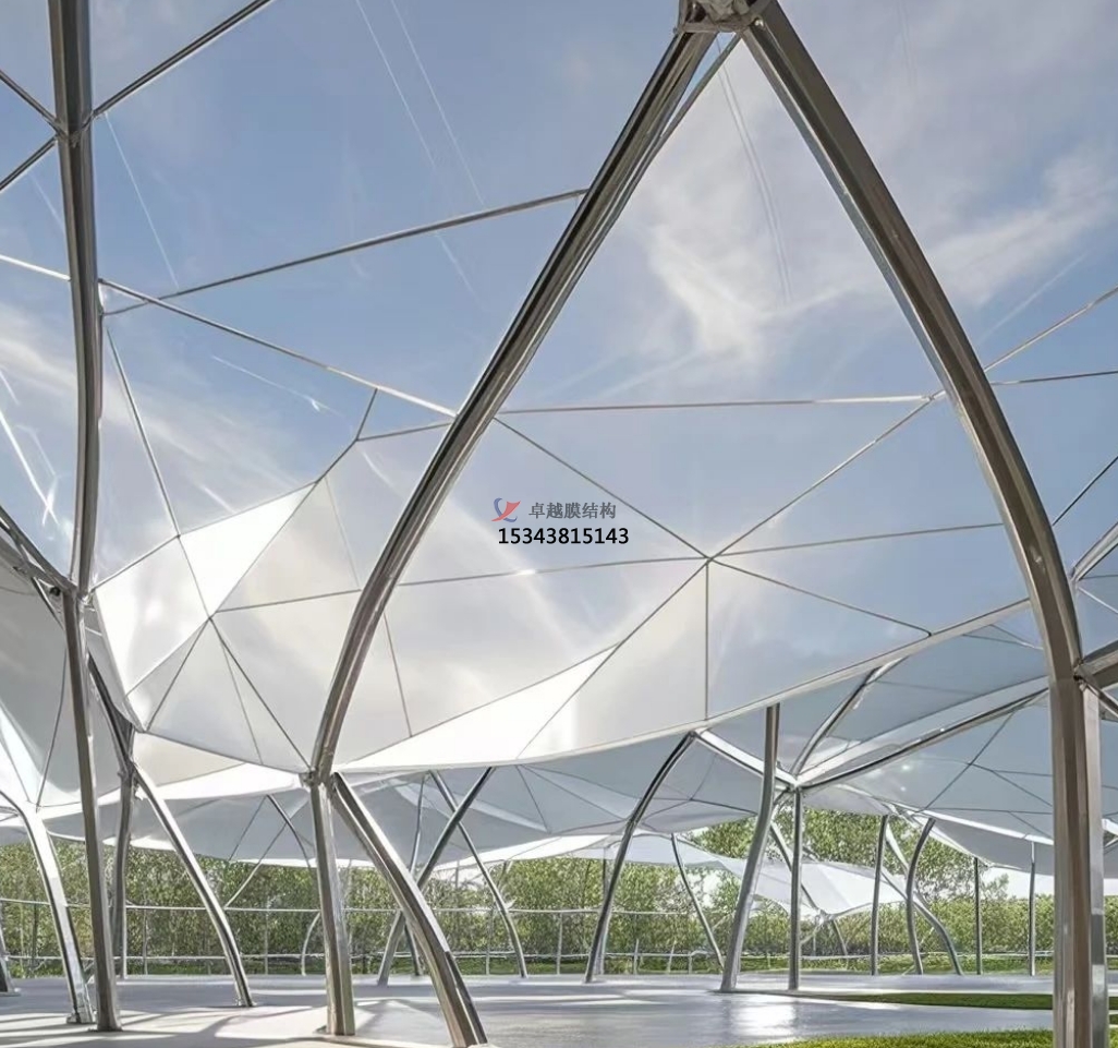 張拉索膜結構:張拉索膜結構通過張拉使膜的內(nèi)部產(chǎn)生一定的預應力,以抵御外界的風荷載和其他荷載。這種結構可以根據(jù)需要制成任意復雜曲面形狀,體現(xiàn)自然流暢之美,同時膜材的多種顏色選擇也使其能更好地適應周邊環(huán)境,滿足建筑效果要求。