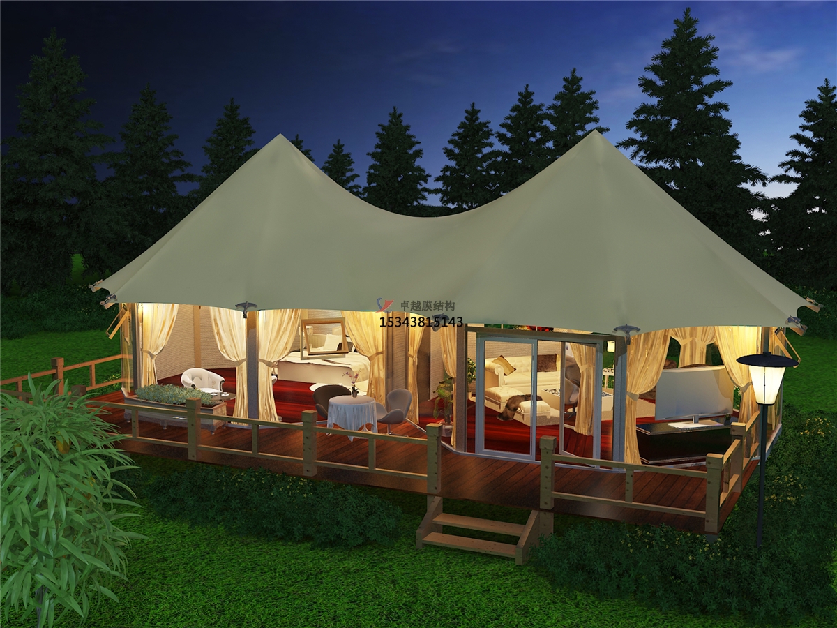 另外由于膜材料本身特有的顯色性,在夜間彩燈的映射下能形成絢麗繽紛的景觀。不僅為人們提供遮陽避雨的空間。同時,更由于這種生動活潑的造型能給人們帶來時尚、輕松的休閑感受,所以廣受歡迎。