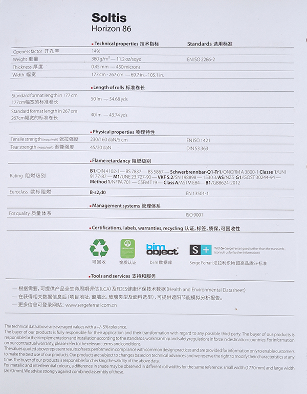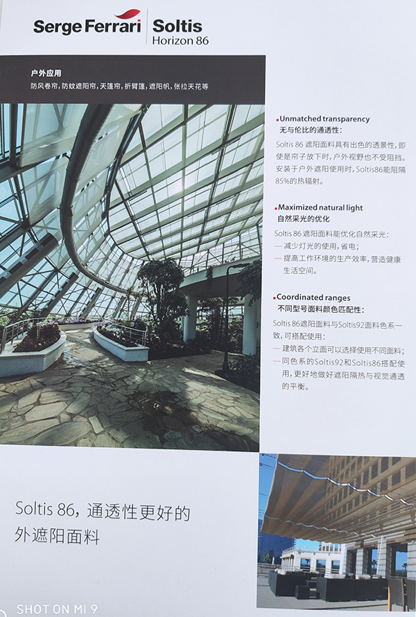 紗帝飾:紗帝飾面料為抵擋熱量和光線的真正盾牌,依靠其微型通風(fēng)結(jié)構(gòu),調(diào)節(jié)陽光的熱效應(yīng),有效地防眩目。紗帝飾面料具有46種顏色,可為所有建筑,無論是 公眾場(chǎng)合還是私人住宅提供配套的眾多色彩和多種用途。法拉利預(yù)應(yīng)力專利制造技術(shù)給紗帝飾織物帶來尺寸恒定,不會(huì)變形,無需加固自然抗撕拉,耐久和抗塵,占 地面積小等獨(dú)有特性,更顯出紗帝飾面料對(duì)建筑物技術(shù)性遮陽無可匹敵的優(yōu)勢(shì)。