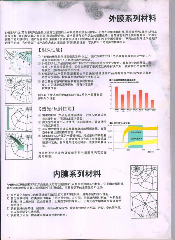 SHEERFILL產(chǎn)品能夠在-70C到+230C的溫度范團內(nèi)安全使用。具有良好的耐熱性、耐濕性、耐藥品性等特性,即使在承受了暴風雪這類惡劣天氣后,膜結構仍然能維持初始狀態(tài),膜材料不會產(chǎn)生松弛。